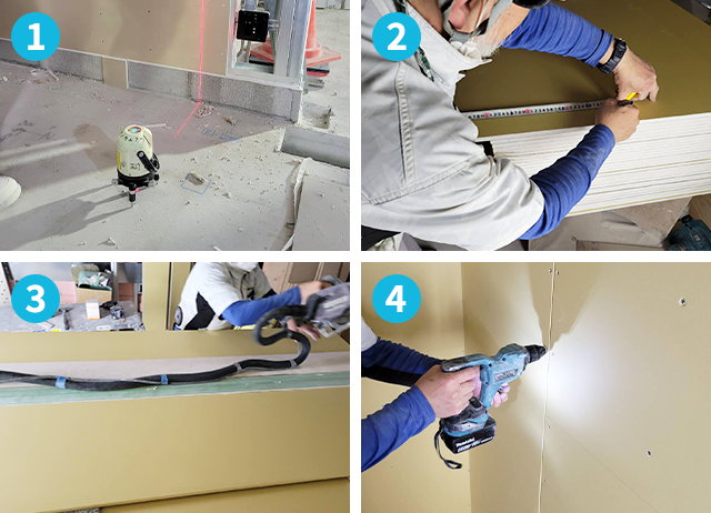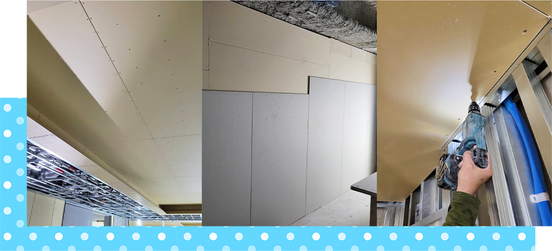 ボード工事は軽天工事で作られた骨組みの上に板状のパネルを張り付け、天井や壁の表面を整えていきます。